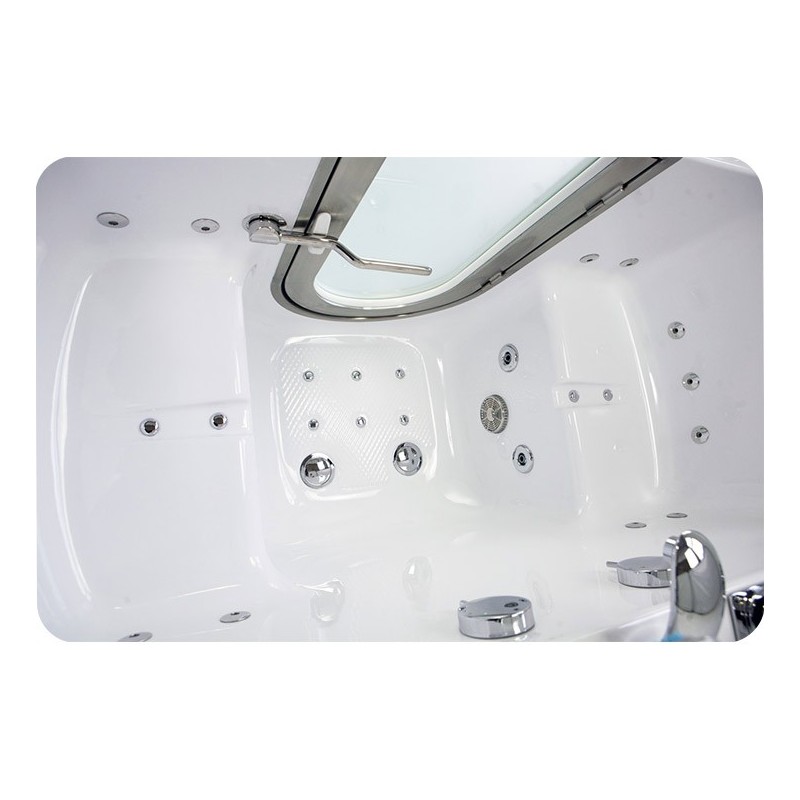 "Ella Companion Dual Massage—Two Seat Walk In Tub Is the two seat version of the original Ella Deluxe. This unique two seat walk in bathtub is perfect for any couple who wants to share the bond and pleasure of bathing together. The Ella Companion Two Seat walk in bath comes standard with a textured slip resistant floor, one deck mount grab bar, two seats for a shared bathing experience and Dual Drain Technology which features two 2-inch drains, two overflows and two drain openers allowing our walk in bathtubs to be drained in as little as 80 seconds. Ella Acrylic walk in baths are constructed of the highest grade white cast acrylic with an easy to clean gloss finish, reinforced with fiberglass. The shell is supported by a stainless steel frame and leveling legs for ease and durability during installation. The supporting frame as well as the Toe Kick Access Panel allow for simple above the floor drain installation, convenient access to the underside of the tub and the ability to lower the threshold for easier step in access. The Companion Models also come with two front access panels and an end panel. The Companion dual massage two seat walk in bathtub has a combination of 28 strategically positioned air and hydro jets complemented by an in-line water heater, Ozone Sterilization System, LED multiple color chromatherapy light with ON/OFF push control, anti-scald thermostatic control valve, and flow rate control for hydro massage. Designer chrome fixtures and user friendly controls put the finishing touch on this relaxing and therapeutic bathing experience. The Ella Companion two seat walk in bath is available as a soaking or dual massage tub. Additional features: High quality cast acrylic grade A Excellent color uniformity 5mm cast acrylic sheet Fiberglass (reinforced) Stainless Steel Frame Low threshold step in 9.5" with the option to lower to 6.5" Seven (7) adjustable stainless steel heavy duty leveling legs Seat Width: 20.25" Stainless steel and tempered glass door, door frame and door seal gasket Removable door for easy cleaning Deck mount safety grab bar LED multiple color chromatherapy light with ON/OFF push control Thermostatic control valve Two (2) removable rubber back support (white) Two (2) front, one (1) toe kick and one (1) side removable access panels Air Massage System: Ten (10) therapeutic air massage jets 0.5HP air pump ON/OFF push control Four (4) adjustable and fourteen (14) fixed hydro jets Air flow regulator for adjustable hydro massage 1.2HP pump (900 Watts) ON/OFF push control In-line water heater (1.5 KW) Ozone Sterilization (12Volts) with ON/OFF push control Brass 5 Piece Ella Faucet Set (Chrome Finish) designer spout, two 2 way diverters with ADA compliant handles, and pull out hand held shower with 5' retractable stainless steel hose"