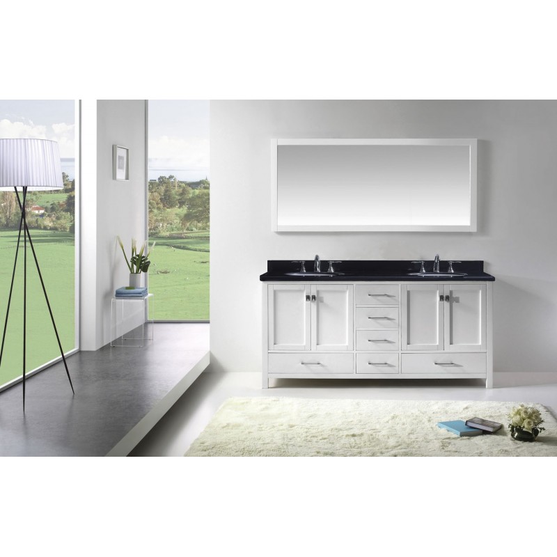 Caroline Avenue 72" Double Bathroom Vanity in White with Black Galaxy Granite Top and Round Sink with Polished Chrome Faucet and Mirror