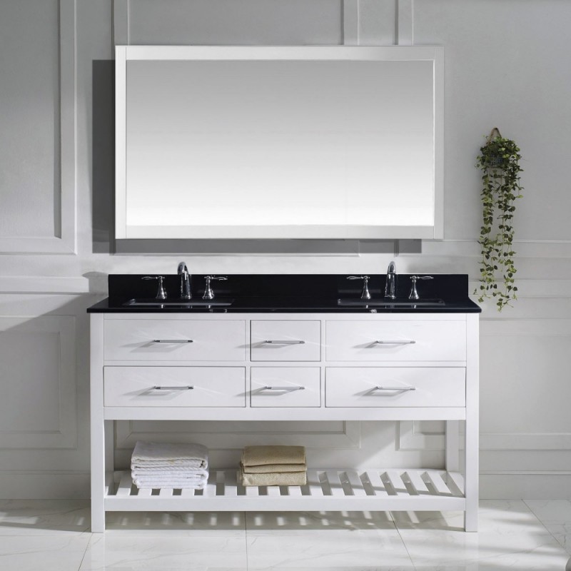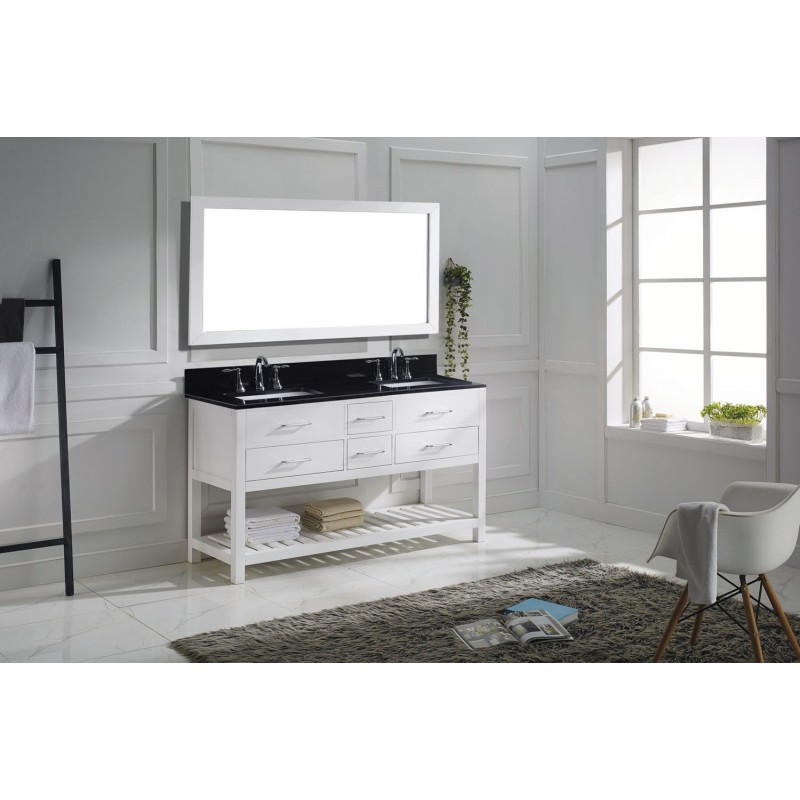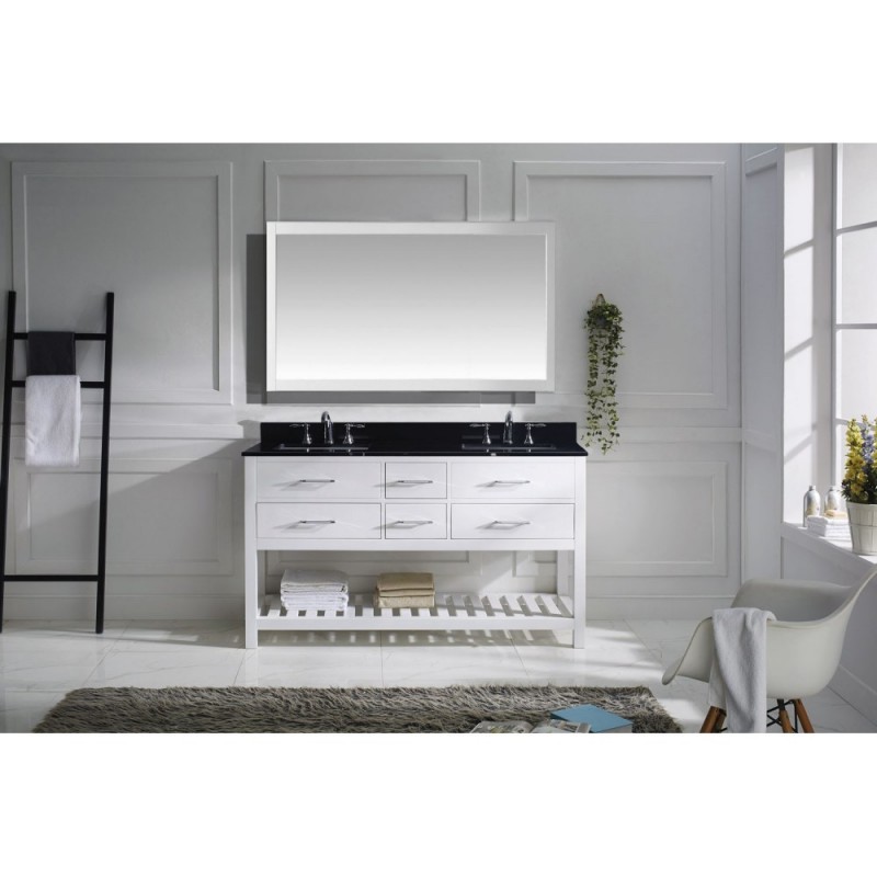 Caroline Estate 60" Double Bathroom Vanity in White with Black Galaxy Granite Top and Square Sink with Polished Chrome Faucet and Mirror