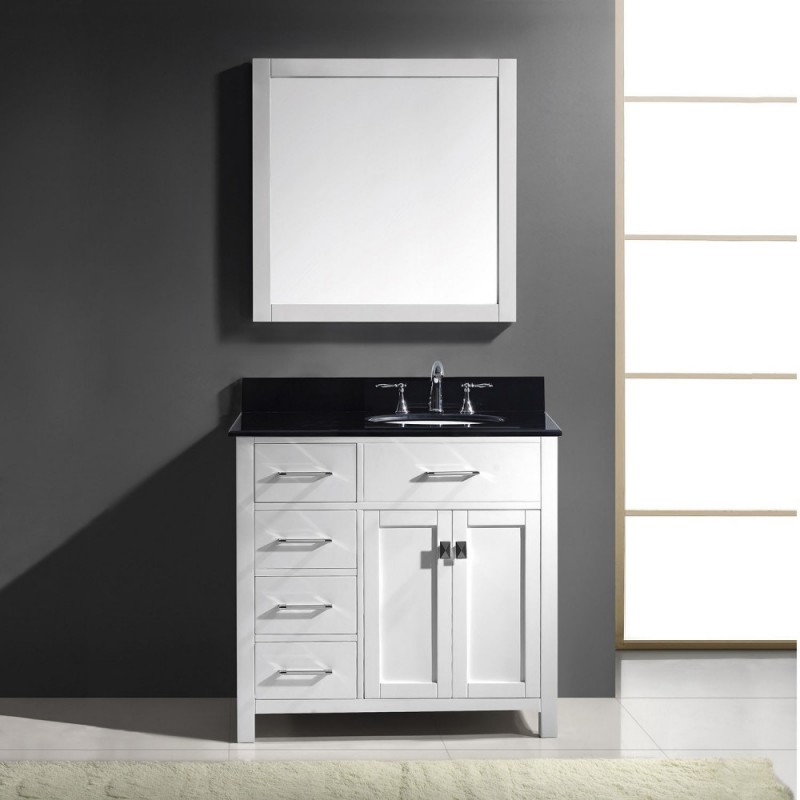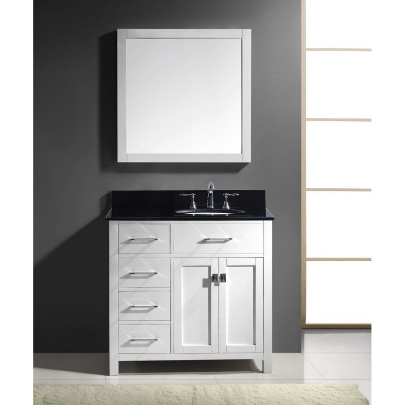 Caroline Parkway 36" Single Bathroom Vanity in White with Black Galaxy Granite Top and Round Sink with Brushed Nickel Faucet and Mirror