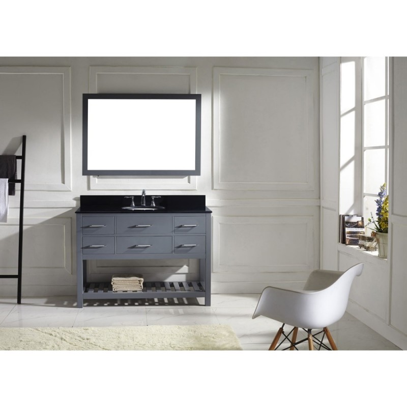 Caroline Estate 48" Single Bathroom Vanity in Grey with Black Galaxy Granite Top and Round Sink with Brushed Nickel Faucet and Mirror