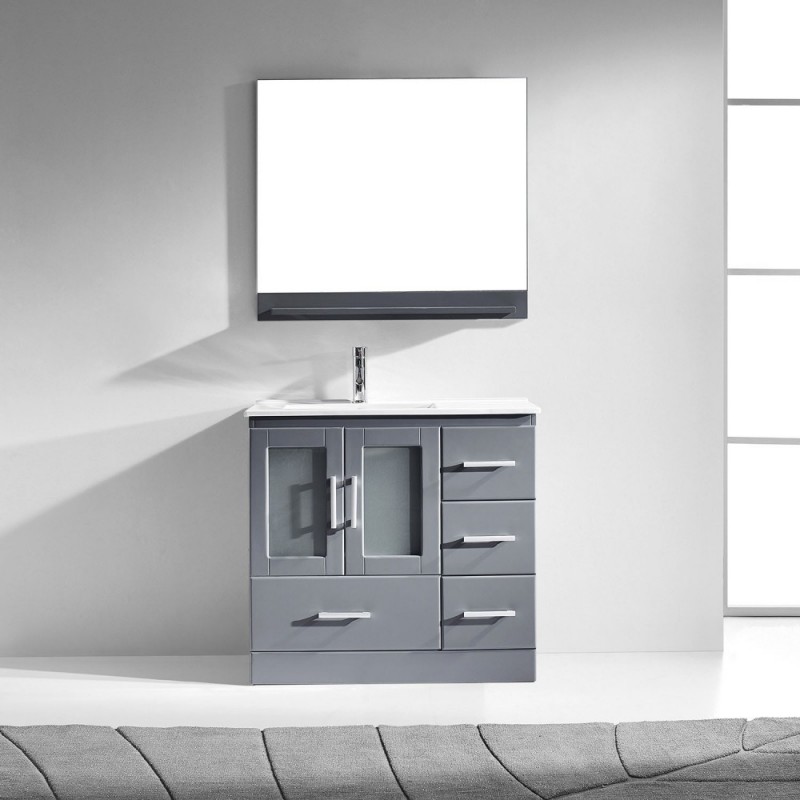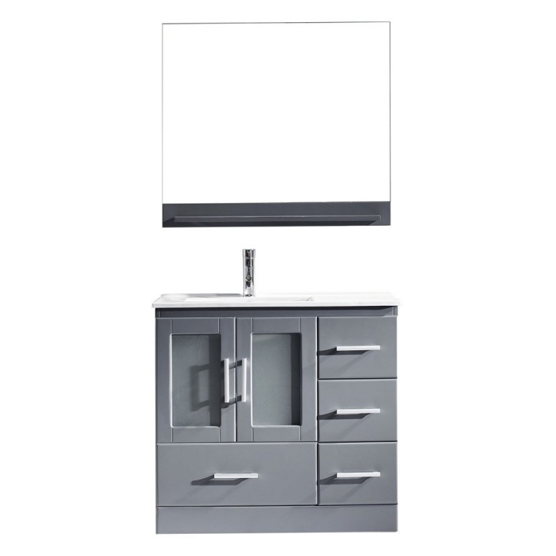 Zola 36" Single Bathroom Vanity in Grey with Slim White Ceramic Top and Square Sink with Polished Chrome Faucet and Mirror