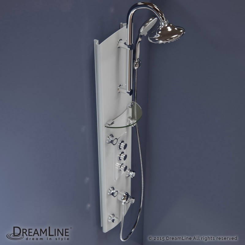 With features like a hand held shower, adjustable body massage sprays, large rain shower head and individual water controls, DreamLine shower panels turn your ordinary shower into a home spa. Add other elements of design like shelves, mirrors and accessory compartments, and your shower not only gets a beauty facelift but also becomes more functional. Installation is easy with only hot and cold water connections and fast mounting on wall-attached brackets. Choose from models made of aluminum, acrylic or stone for the right solution for your bathroom.
