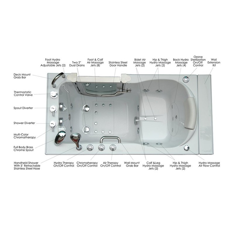 "The Ella Petite Dual Massage Walk In Tub Is designed to fulfill the need for a smaller walk in bath. The Ella Petite Models have a seat that is as wide as the standard size Ella Deluxe Model (19 3/4 inches). At 2 inches narrower than our standard size, the Ella Petite Soaking Model still offers the same luxurious features such as a unique detachable swivel tray, ability to lower the step in threshold, a removable rubber backrest, and a sleek chrome finish 5 piece faucet with a pull out hand shower. A perfect solution for those in need of safer bathing, the Ella Petite walk in tub comes standard with a textured slip resistant floor, a deck mount safety grab bar, and Dual Drain Technology which allows the tub to drain in as little as 80 seconds. For guaranteed exit reliability, the Ella Petite walk in tubs are equipped with two 2-inch drains, two overflows and two drain openers.Ella Acrylic walk in baths are constructed of the highest grade white cast acrylic with an easy to clean gloss finish, reinforced with fiberglass. The shell is supported by a stainless steel frame and leveling legs for ease and durability during installation. The supporting frame as well as the Toe Kick Access Panel allow for simple above the floor drain installation, convenient access to the underside of the tub and the ability to lower the threshold for easier step in access. The Petite Models also come with two front access panels, an end panel and a wall extension kit to fit our tubs into a standard 60 in. opening.The Ella Petite Dual Massage walk in tub has a combination of 24 strategically positioned air and hydro jets complemented by an in-line water heater, Ozone Sterilization System, anti-scald thermostatic control valve, LED multiple color chromatherapy light and flow rate control for hydro massage. Designer chrome fixtures and user friendly controls put the finishing touch on this relaxing and therapeutic bathing experience.The Ella Petite is available as a soaking or a dual massage tub. Plus the customer has the choice between a left or right hand side door and drain. Also, the Ella Petite Dual Massage Walk in Tub can be purchased without a faucet and no pre drilled holes—allowing the customer to choose their own faucet. Additional features:High quality cast acrylic grade A Excellent color uniformity 5mm cast acrylic sheet Fiberglass (reinforced) Stainless Steel Frame Low threshold step in 8" with the option to lower to 5" Seat Width: 19.75" Eight (8) adjustable heavy duty leveling legs Stainless steel and tempered glass door, door frame and door seal gasket Removable door for easy cleaning Deck mount safety grab bar LED multiple color chromatherapy light with ON/OFF push control Thermostatic control valve Removable rubber back support (white) Unique removable swivel tray (Patent Pending) Two (2) front, one (1) toe kick and one (1) side removable access panels Wall extension kit to fit in standard 60” opening (extends to 59") Ten (10) therapeutic air massage jets 0.5HP air pump ON/OFF push control Four (4) adjustable and ten (10) fixed hydro jets Air flow regulator for adjustable hydro massage 1HP pump (900 Watts) ON/OFF push control In-line water heater (1.5 KW) Ozone Sterilization (12Volts) with ON/OFF push control Brass 5 Piece Ella Faucet Set (Chrome Finish) designer spout, two 2 way diverters with ADA compliant handles, and pull out hand held shower mixer with 5' retractable stainless steel hose."